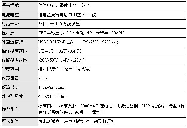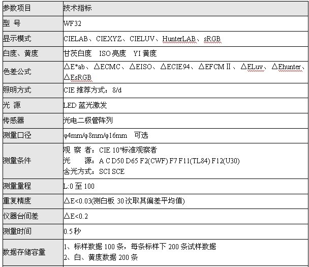 WF32色差仪是一款高精度、高稳定性、多功能的色差仪。WF32拥有8种测量光源(A、D50、D65、C、F2、F7、F11和F12);六种显色模式(CIE1976LAB、CIEXYZ、CIELUV、HunterLAB、sRGB、白黄度);八种色差公式(△E*ab、△ECMC、△EISO、△ECIE94、△EFCMⅡ、△ELuv、△Ehunter、△EsRGB);三种语言模式(简体中文、繁体中文和英文);有三种测量口径供用户选择。WF32色差仪还能进行白黄度测量和平均测量,有大容量数据存储空间,也可以外接微型打印机进行测量数据的实时打印,并能与仪器标配的《颜色分析系统》软件配合使用。